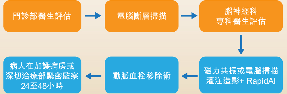 严重中风患者若在接受静脉血栓溶解治疗後未见改善,或送院时已超过相关治疗时限,本院会启动中风急救治疗ASAP 2.0机制,安排病人接受磁力共振或电脑扫描灌注造影(包括脑部及脑血管扫描),以确定血管阻塞位置,并利用最新人工智能系统RapidAI计算可挽救脑组织与坏死脑组织的数量和比例,以判断患者是否适合接受动脉血栓移除术。