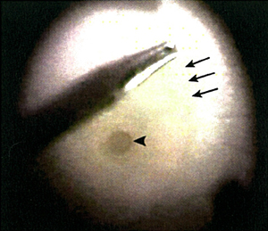 ![]() 圖1:手術期間的情況(從醫生的角度望向患者左眼):利用眼內手術夾,在已形成的黃斑點穿孔(箭頭所指位置)附近夾起內界膜(箭頭所在位置)。 |