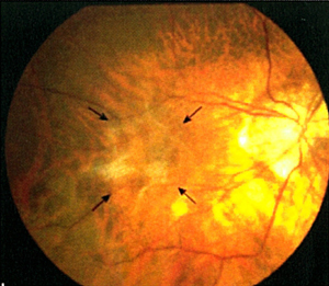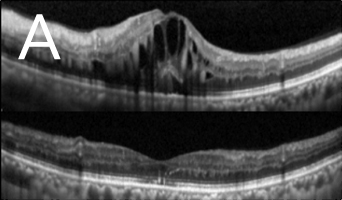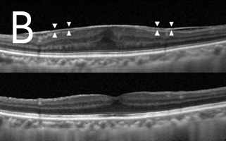 ![]() ![]() Photo 3: 圖3:光相干性斷層造影(OCT):(A)發現大量黃斑點裂損,並有視網膜黃斑點凹位脫落跡象,且在黃斑點凹位附近發現不正常的玻璃體牽引(箭頭所指位置)。(B)手術後六個月黃斑點裂損的情況大有改善,減少視網膜黃斑點脫落的幅度。 |