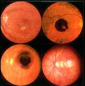 近視超過600度的人士眼球拉長的情況非常嚴重,黃斑點亦被拉扯變薄。再加上不正常的玻璃體和黃斑點視網膜前膜增生之牽引,導致黃斑點神經組織裂開,甚至喪失視力。如未能及早施行適當治療,黃斑點裂損有可能進一步惡化,導致黃斑點穿孔和黃斑點視網膜脫落。利用光相干性斷層造影可及早發現並作出準確的診斷(圖3)。治療方法是施行扁平部玻璃狀體切除術,移除凹前表質玻璃體,並進行氣體和液體交換,治療可治癒大部份病人的黃斑點凹位,而大部份病人在手術後亦無須保持俯臥。