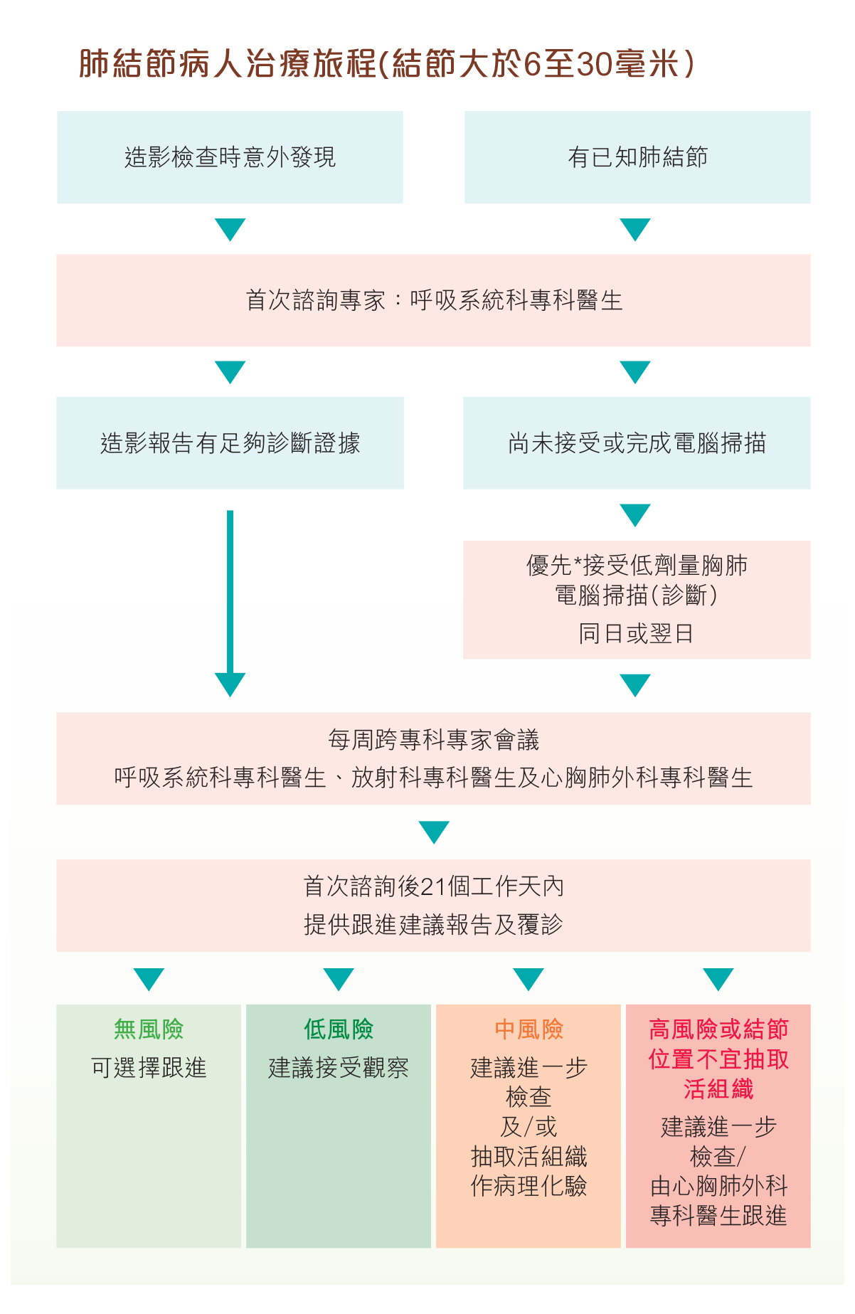 當發現肺結節後,下一步如何處理取決於結節的大小,肺癌風險以及在電腦掃描顯示的結節特性(實性或磨砂玻璃樣)。對沒有肺癌風險的病人而言,i.) 6毫米以下的結節不需要定期跟進;ii) 6至8毫米的結節需在半年後以電腦掃描觀察;iii) 8毫米以上的則要考慮抽取活組織作進一步檢查。